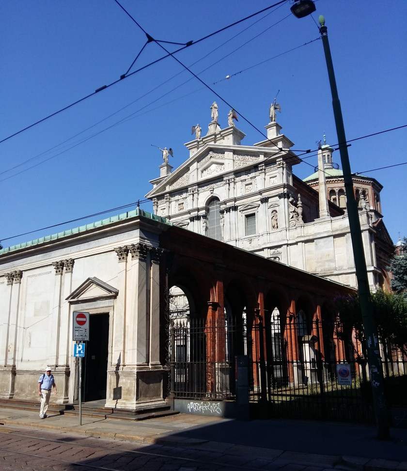 In poche parole Milano d’estate. Poi decidi di entrare in quella chiesa che ti guarda sempre ma che non consideri mai. C’è un nartece colonnato, una fontana all’ombra di un portico che diffonde l’unico rumore che miracolosamente si percepisce.