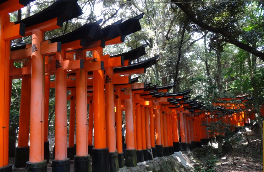 Sud est Kyoto, Immaginate un enorme serpente vermiglio, formato da centinaia e centinaia di torii disposti l’uno di seguito all’altro, a intervalli di trenta centimetri, che si snoda sulla collina, seguendone i dislivelli.