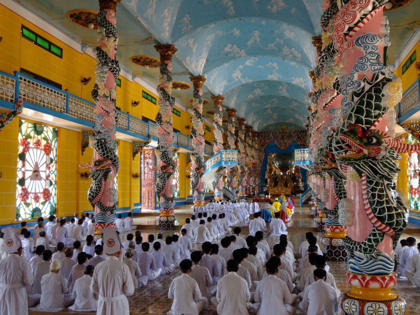 Il grande tempio che sorge al centro della cittadina, circondato dagli edifici amministrativi e formativi della religione, è un curioso quanto affascinante mix tra una chiesa cattolica rococò, un tempio della Cina Meridionale e il quartier generale di una setta esoterica. Ovunque domina il grande occhio del Caodai che tutto osserva. Dalle colonne che dividono le navate, scendono dragoni cinesi ma negli elementi decorativi si incontrano anche svastiche buddiste e finestre di tradizione islamica. L’impressione generale è che l’architetto di questa cattedrale, naturalmente lo stesso Caodai che ne dettò il progetto, abbia voluto fondere, in un edificio assolutamente non convenzionale, l’idea del tempio propria della tradizione cinese e quella della chiesa cattolica. Sicuramente non si tratta di un’architettura mistica ed essenziale come la possiamo intendere noi occidentali, ma è sicuramente un qualcosa di davvero unico.