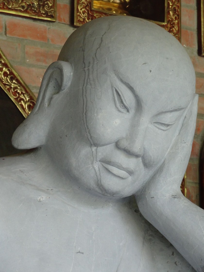 Ricostruire un percorso tra gli spazi sacri di quel grande monastero dove, cosa ormai non troppo frequente in Cina, esistevano ancora gli assi secondari paralleli a quello principale lungo cui erano allineati i padiglioni principali, era la mia priorità e il tempo passò veloce. Era ormai pomeriggio quando vidi dei monaci dirigersi verso un grande padiglione che avevo già visitato nel mattino e che era in gran parte vuoto, eccetto per alcune ordinate file di cuscini arancioni disposti sul pavimento, davanti a una grande statua del buddha Sakyamuni. Li seguii ma trovai questa volta i cuscini in gran parte occupati da monaci di età diverse che erano in attesa di iniziare una cerimonia. Feci per ritirarmi ma uno di loro mi indicò alcuni cuscini disposti lungo il fianco del padiglione.
