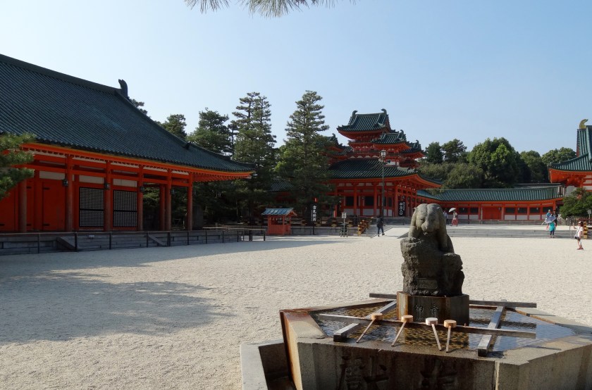 In front of the Oten-mon, the “Divine Gate”, the main entrance to Heian Jingu, there is a group of noisy Chinese. Their presence hurts me, expecting a Japanese silent composure and control of emotions, but my negative thinking remains as blocked. The view runs over the structures of the wooden sanctuary painted in a lively vermilion color, and what I see now is nothing more than a tribute to the ancient Chinese civilization, to which Japan owes customs, philosophy, religions, and even a city. This city.