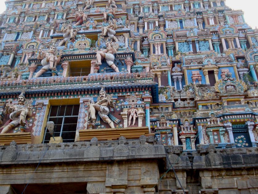Dedicato all’etere o, secondo altre interpretazioni, allo spazio informe, questo tempio celebra in realtà sin dalla sua dedica, la Nataraja, la danza cosmica di Shiva. Per rendersene conto basta alzare gli occhi verso il variopinto gopuram, alto una quarantina di metri e strutturato su sette livelli, e osservare le statue che, sui due lati della torre (anzi delle quattro torri), eseguono i 108 movimenti canonici della danza sacra Baharat Natayam, così come è descritta nell’antico trattato del Natya Sastra.