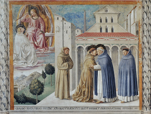 Il celebre affresco di Benozzo Gozzoli, conservato nella chiesa di san Francesco a Montefalco in Umbria, mostra l’incontro tra san Francesco e san Domenico, i fondatori dei due più importanti ordini religiosi del XIII secolo che danno inizio a uno grande periodo di rinnovamento della Chiesa. Avviene infatti il passaggio da una visione puramente contemplativa della vita religiosa a una dimensione più pratica e vicina alla società. Le abbazie diventano conventi, i monaci frati. Se nelle abbazie la sopravvivenza era assicurata dal possesso di terre e da un’economia di florida autosufficienza, i nuovi ordini, sorti a partire dal 1215, affidano il loro sostentamento alla carità altrui; da qui l’appellativo di “mendicanti”.