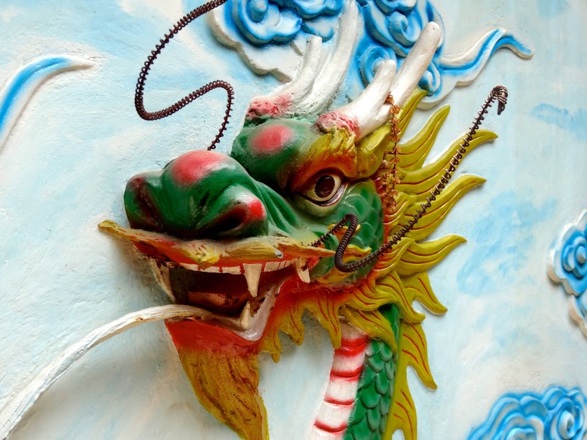 Quando parlavo di eccesso di decorazione non esageravo di certo: alzate gli occhi e troverete ovunque immagini, composizioni, fregi, miriadi di figure, come queste che si trovano in un’altra importante e bellissima pagoda del quartiere. la Phuoc Han Hoi Quan.