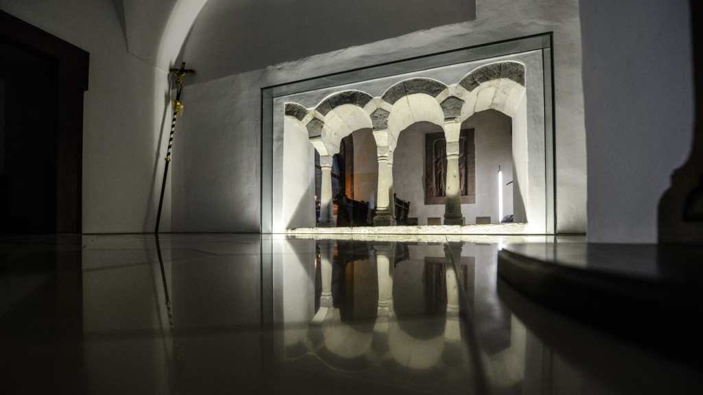 Non è certamente per l’arte che si viene a Plankstetten. La chiesa, edificata in stile romanico, ma che conserva dell’epoca solo parte di una torre e il portale di ingresso oggi preceduto da un atrio barocco, è un ambiente molto luminoso e accogliente. All’interno, completamente rifatto in epoca barocca dove spiccano nelle navate alcuni pregevoli altari, segnalo la sorprendente cripta edificata nel XX secolo e ricoperta di vivaci affreschi come una chiesa bizantina a testimonianza di una vocazione ecumenica. Sulla destra della chiesa di possono vedere tre campate del demolito chiostro gotico con poderose nervature.