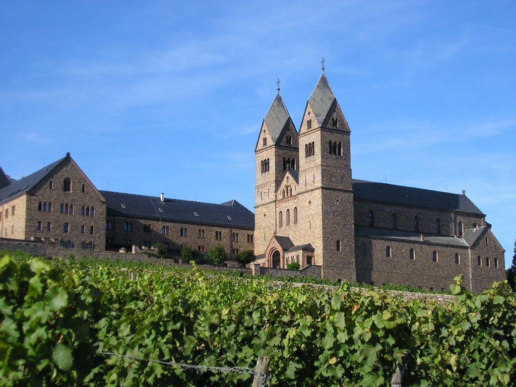 L’approccio all’abbazia fondata dalla grande santa Ildegarda, una delle più straordinarie figure del medioevo cristiano, è invitante: le due torri si stagliano tra i vigneti a mezza collina. Sotto scorre il Reno, qui in uno dei tratti più pittoreschi, e il monastero sembra sovrastare anche la mole un po’ tetra del castello di Rudesheim. Da questo villaggio, ricco di locali, ristoranti e pensioni, si sale dolcemente fino al monastero. Gli edifici attuali, costruiti in stile neo-romanico, non sono antichi, e faccio fatica a credere che la comunità che li abita sia ereditaria di una delle più ricche e importanti tradizioni della storia europea, non solo monastica. La storia è lunga ma anche il vino delle monache di Eibingen è uno dei must della produzione monastica, non solo in Germania. Infatti, accanto al moderno e grande negozio che mette in vendita libri, souvenir e articoli religiosi, spicca una fornita enoteca. Ma ci sono anche prodotti del mulino, dolci, creme e, naturalmente, specialità di erboristeria del ricettario di Ildegarda.