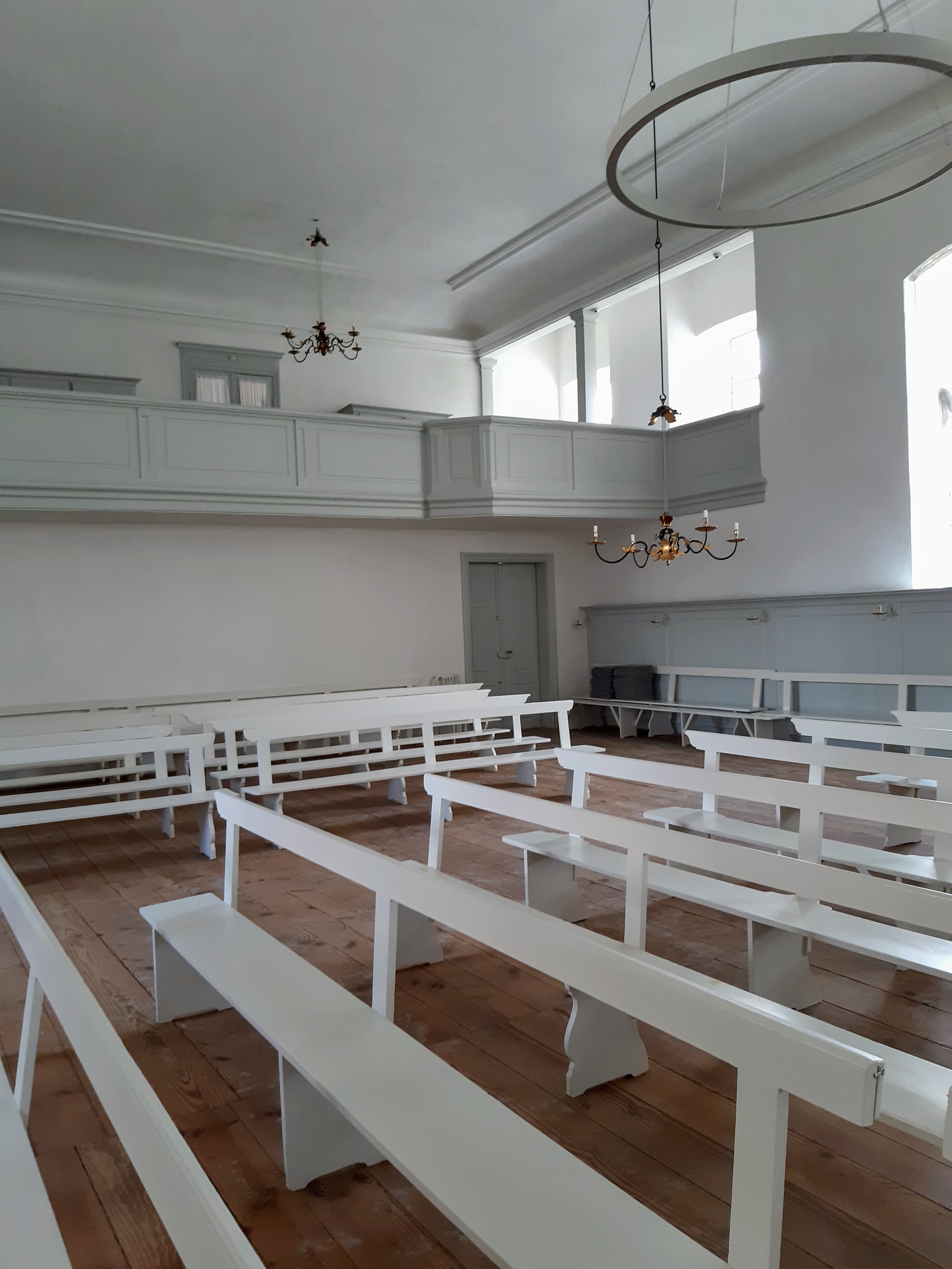 The interior is of disarming and engaging simplicity. The benches, made of white-painted wood, face the simple pulpit, covered in green fabric, from where the preacher leads the Sunday celebration. For the Moravian Brethren, music is very important, especially in the alternating singing of hymns that is the basis of the services but a tradition of brass instruments has also been established in Christiansfeld.
