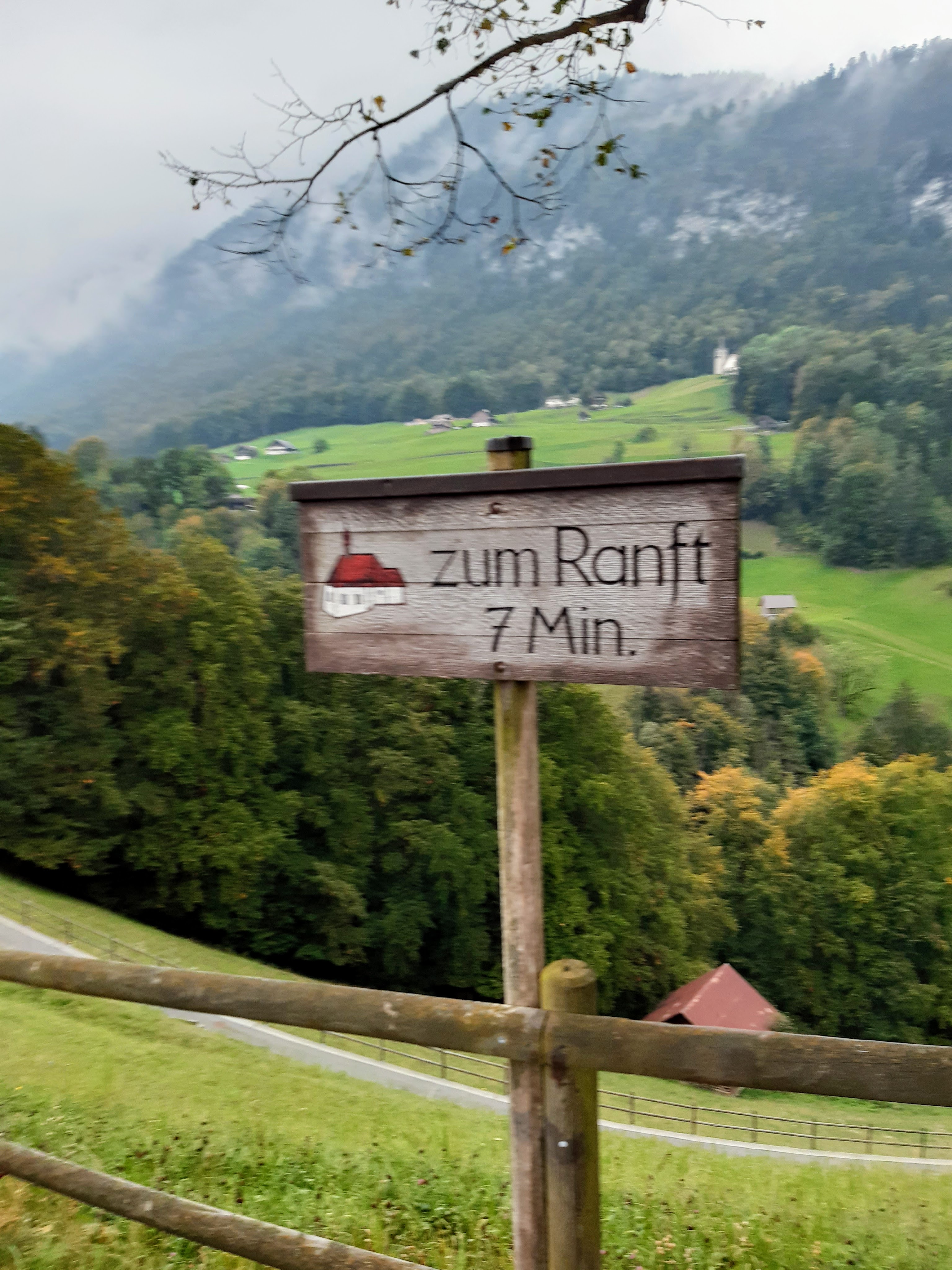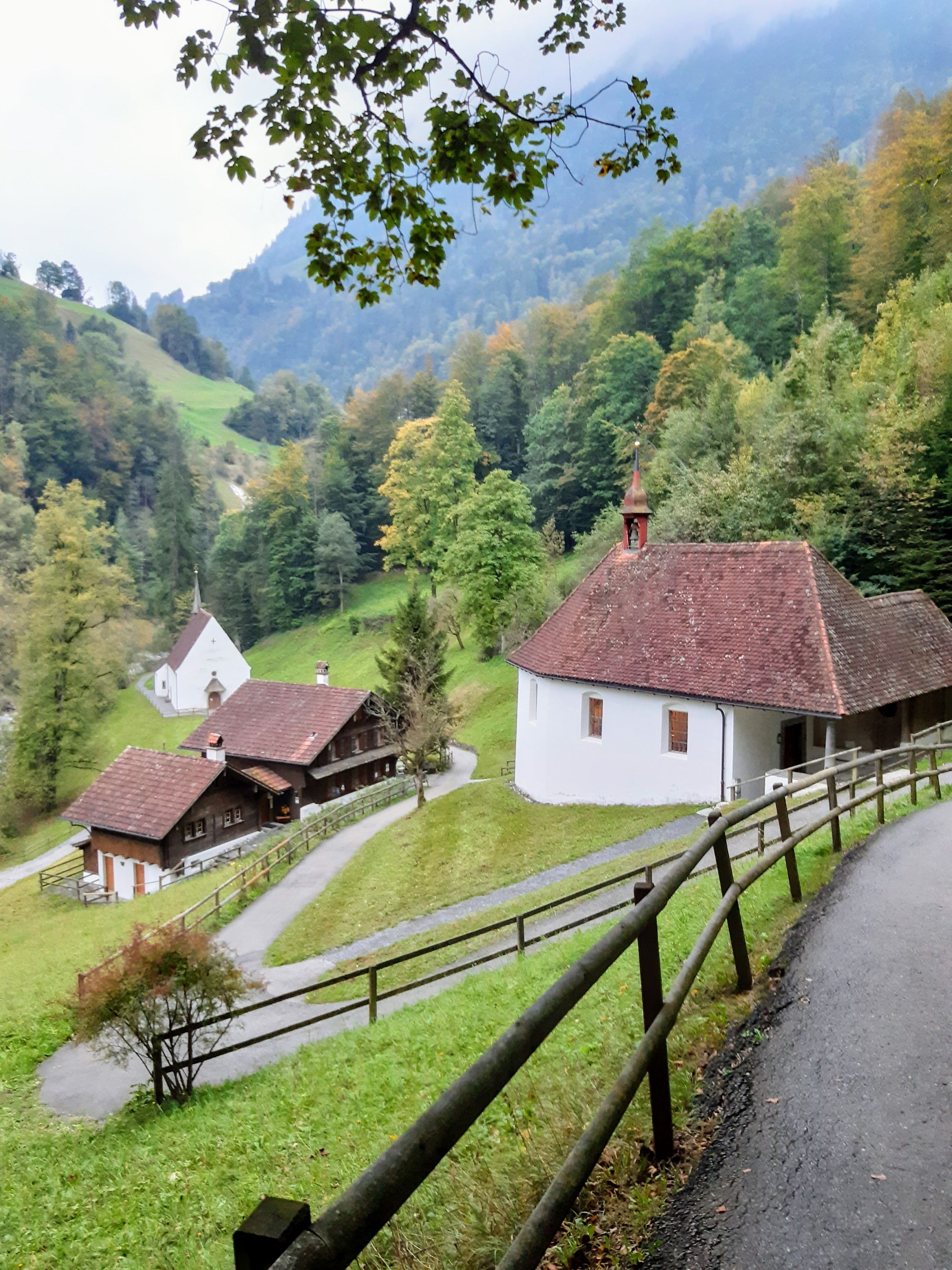 Il sentiero che scende al Ranft è oggi asfaltato e fiancheggiato da panche in legno che facilitano il riposo e la contemplazione della valle. Il silenzio è assoluto, rotto solo dal suono prodotto dall’impetuoso torrente Melchaa che si insinua nella stretta gola. Nascosto tra gli alberi, l’eremo non appare subito, poi, superata una curva in forte pendenza, ecco le due semplici cappelle e due semplici case in legno. Il santuario di Fratello Nicolao è tutto qui. Semplice, austero, silenzioso: il nostro incontro non sarà molto diverso da quello che ebbero pellegrini e illustri visitatori che scesero fin qui a rendere omaggio al santo della Flue nel corso dei secoli. Trovo questo rispetto e questa assenza di una qualsiasi forma di celebrazione monumentale (pensiamo a quanto fatto in altri luoghi per altri santi!) estremamente toccante per questo, per me una sosta all’eremo del Ranft è sempre un’esperienza che ha pochi eguali.