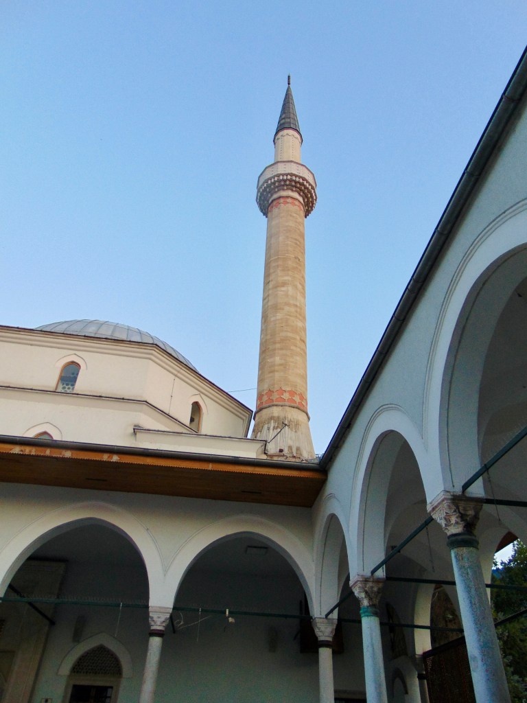 Chi ha visitato e amato la Turchia (Istanbul ma anche Edirne o Bursa) non rimarrà certo impressionato davanti a questa moschea dalle dimensioni abbastanza contenute che rieccheggia, sia nella decorazione che nella scansione degli spazi, il modello codificato nel XVI secolo e poi divenuto classico. Interessante è visitare, oltre alla moschea, la Madrasa (scuola coranica) che si trova proprio di fronte attraversando la Sarači (si può scegliere un biglietto comulativo di 5 marchi (più o meno 2,5 euro) per visitarle entrambe). La Madrasa originale organizzata attorno a un cortile interno su cui si aprivano le celle degli studenti, ospita oggi una piccola e abbastanza insignificante esposizione. Meglio quindi ammirarne l’architettura e la scansione degli spazi che è alquanto affascinante. Per chi avesse tempo, consiglio di visitare anche l’adiacente e modernissima biblioteca (biglietto a parte) dove, oltre a una esibizione di antichi Corani e di testi sacri, si può assistere alla proiezione di un breve documentario che racconta come vennero salavati per volontà di un coraggioso bibliotecario centinaia di antichi preziosi volumi durante i giorni dei bombardamenti.