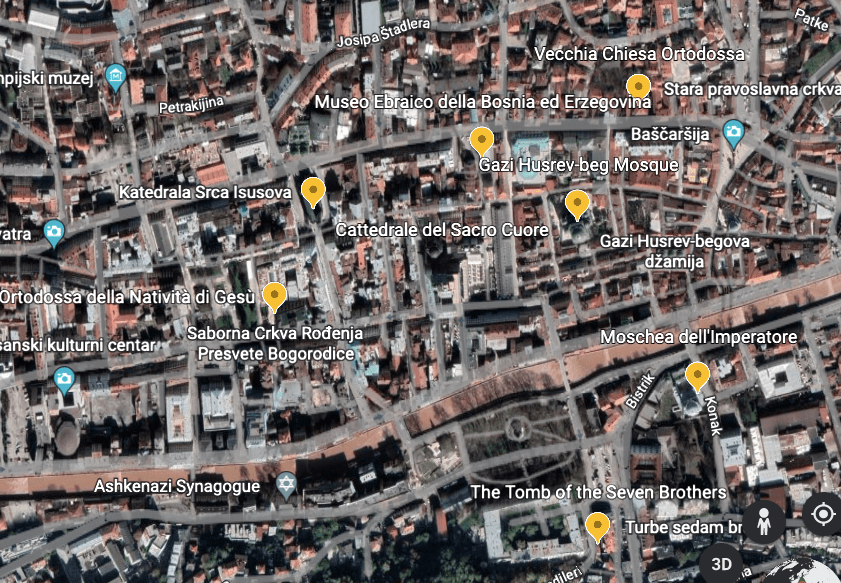 Proseguendo ancora, vi trovereste ad ammirare edifici di stile socialista risalenti a quando, ai tempi della Yugoslavia, il processo di fusione tra le tre anime della città e della Bosnia (serbo ortodossa, croato cattolica e bosniaco musulmana) pareva essersi risolto in un felice esperimento di convivenza che era già stato possibile sia sotto la dominazione turca che sotto quella asburgica.