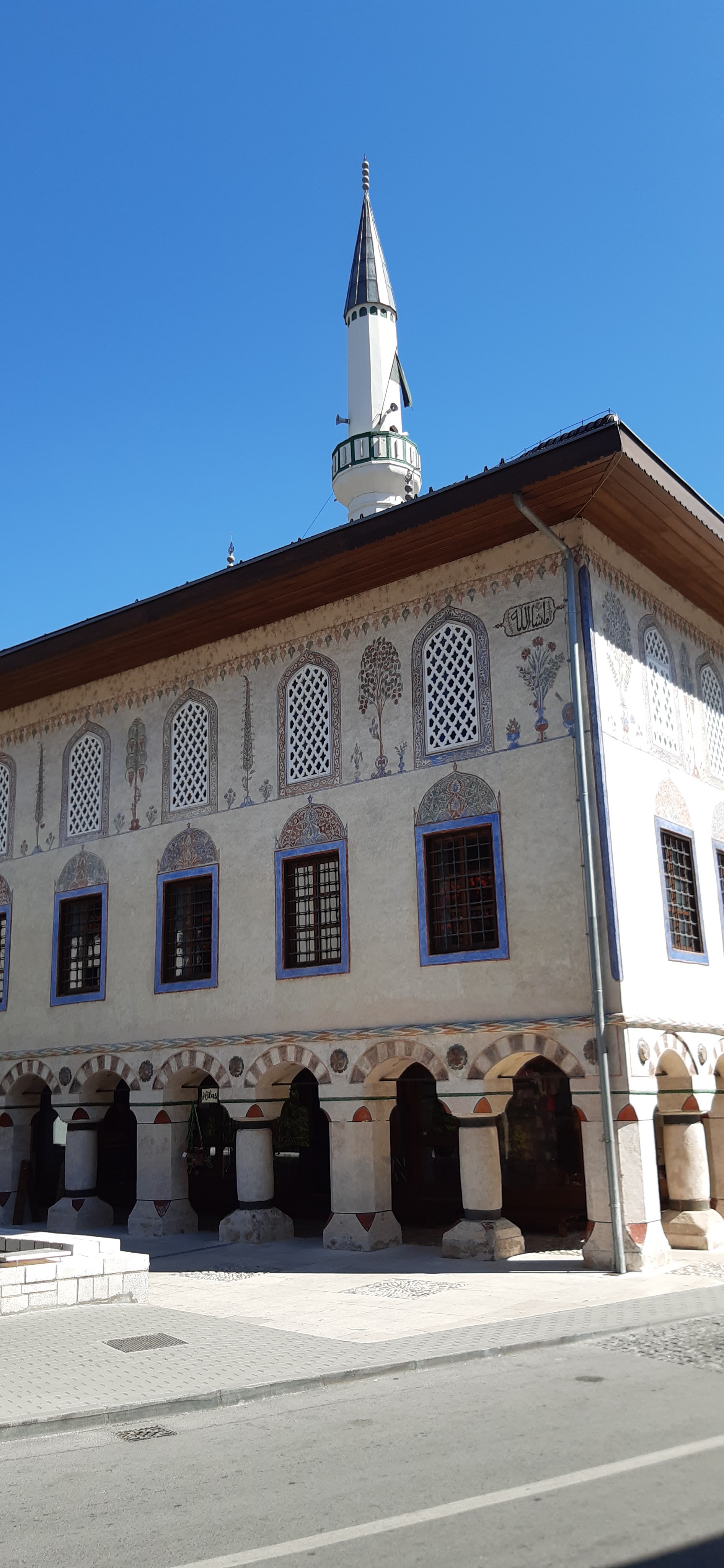 Un edificio su tre livelli, con la facciata decorata da delicati motivi floreali, identifica la Moschea Dipinta, costruita nel XVIII secolo e poi rifatta nelle forme attuali in epoca asburgica.