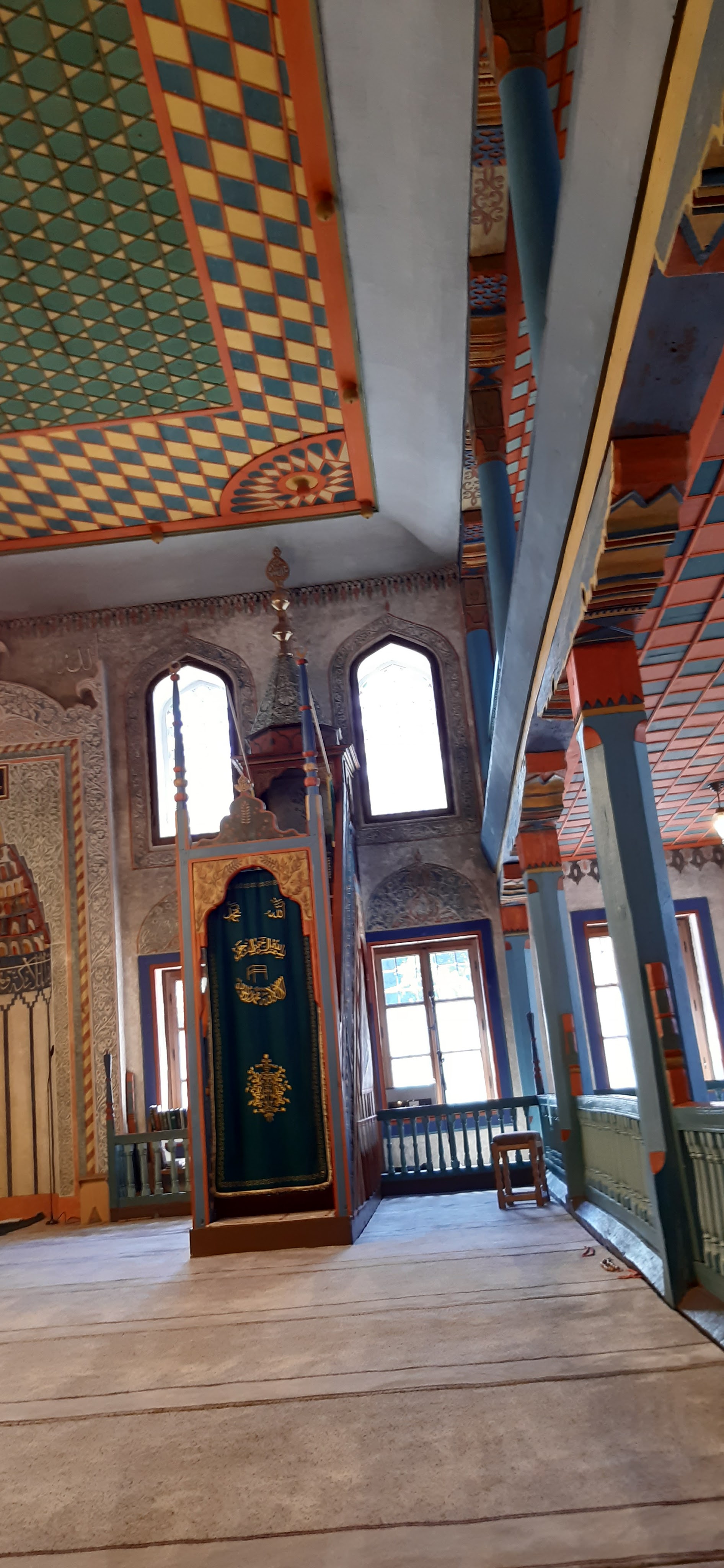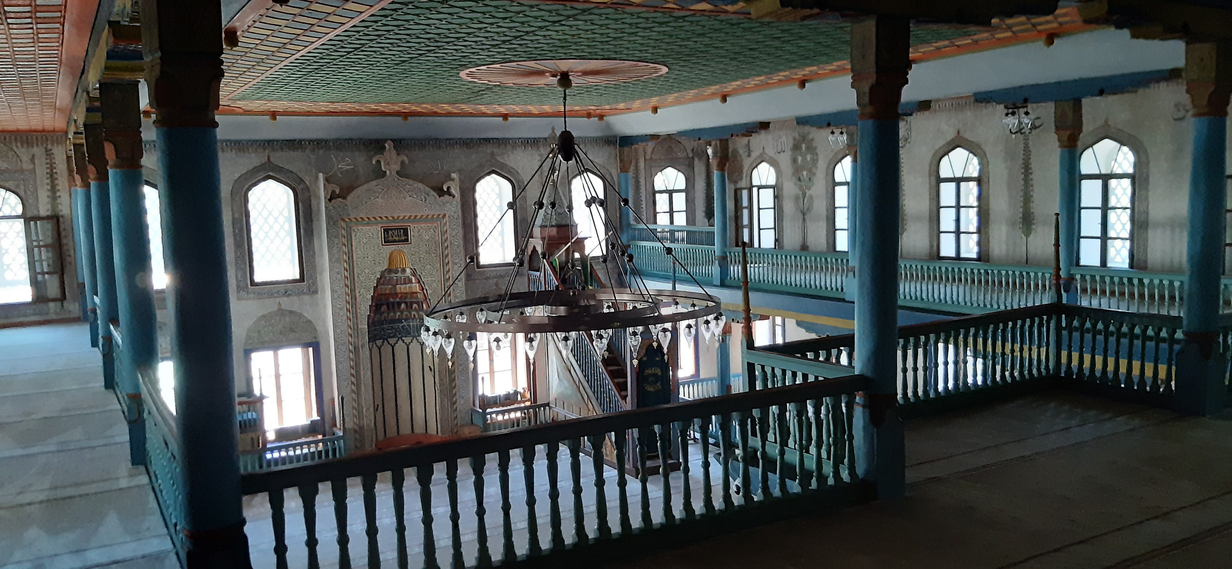Salendo al piano superiore, nell’area riservata alle donne, si ha una visione ancor più completa e affascinante dell’edificio. Fregi calligrafici, decori, e il bellissimo soffitto ligneo dipinto nei toni del verde splendono nella luce che entra dalle numerose finestre che corrono tutt’attorno allo spazio.