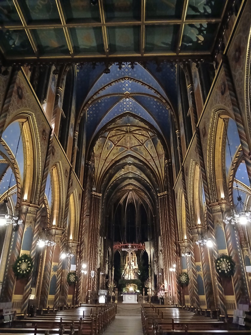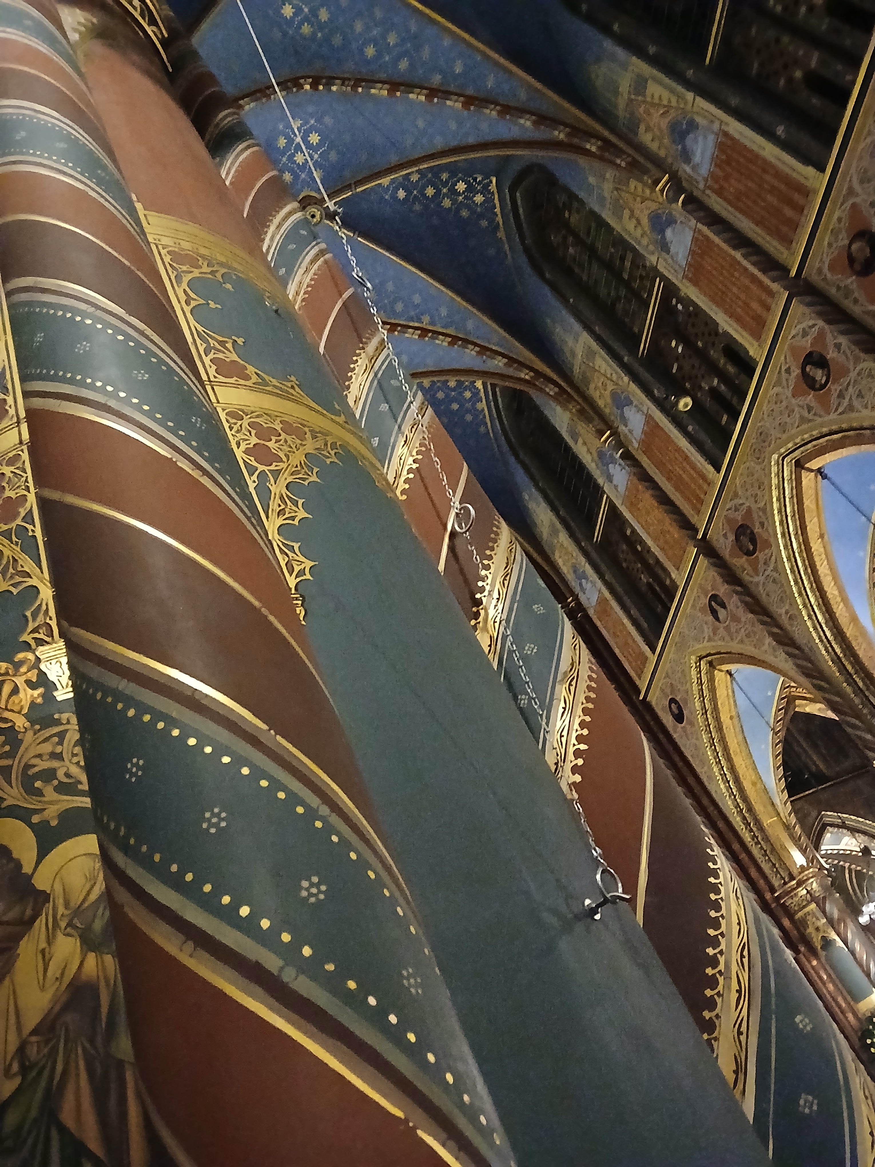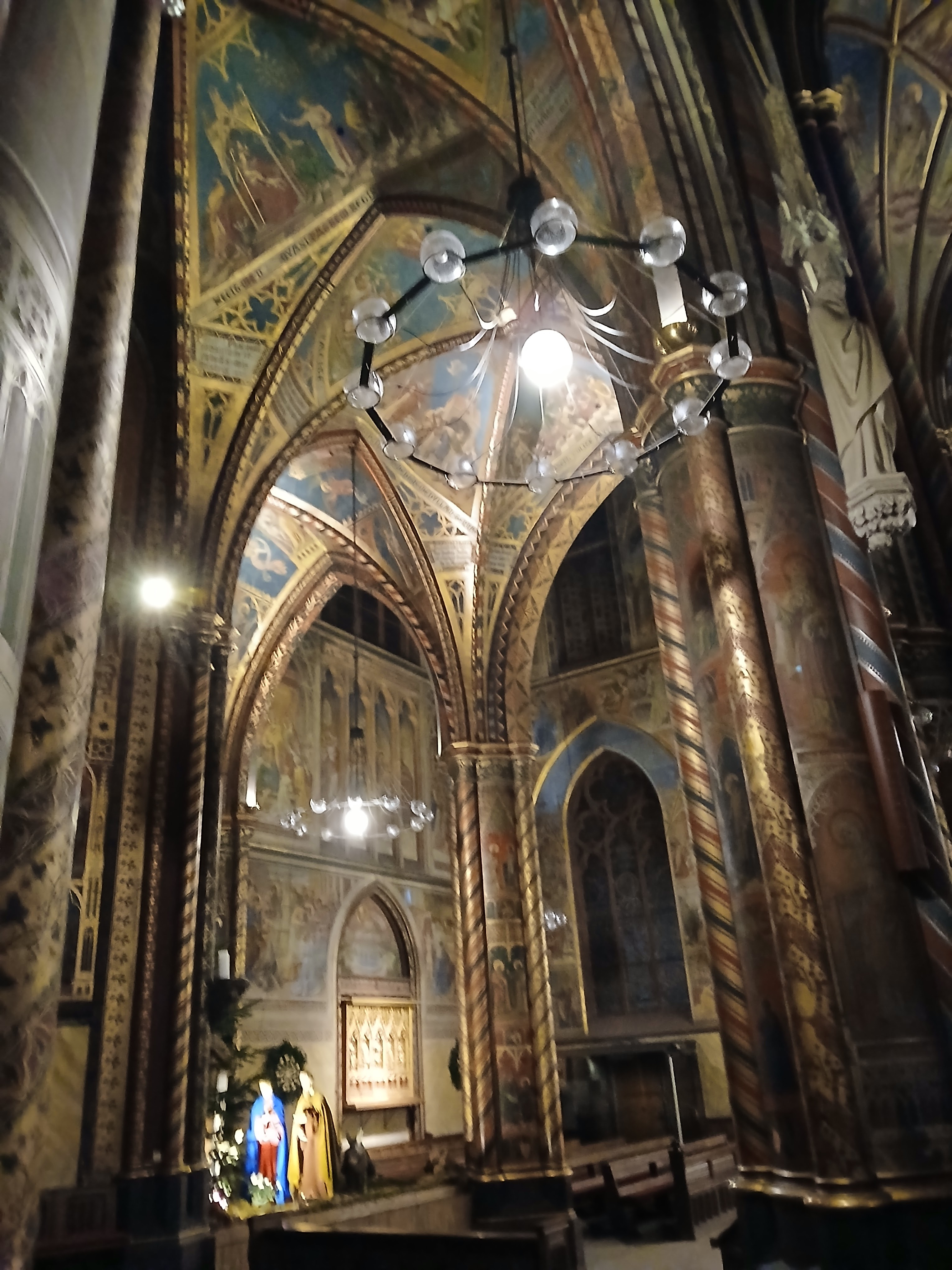 Ci sono alcuni aspetti dell’architettura gotica che sono entrati nel nostro immaginario comune, tra tutte l’assenza di colore, quasi che il colore sia un elemento frivolo e distraente, diminutivo della severità, dello slancio spirituale, della austera santità necessarie a una Casa di Dio. Si resta quindi abbastanza sconcertati entrando in questa grande basilica dove ogni superficie è invece ricoperta di affreschi e decorazioni geometriche.
