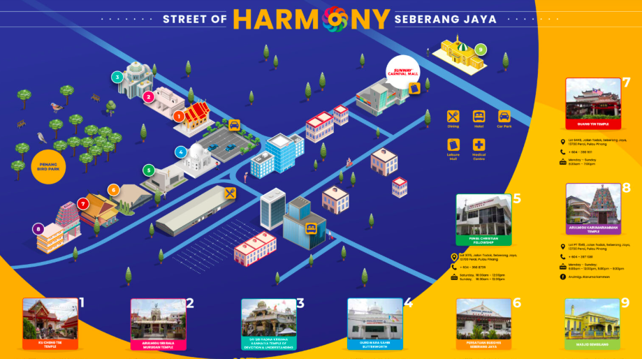 Questa percezione di fusione culturale, estetica e spirituale si manifesta in alcune Strade dell’Armonia in cui chiese, moschee, templi cinesi o indiani, sia induisti che sikh si susseguono, permettendo a chi le visita di compiere una vera esperienza multi religiosa in un centinaio di metri.