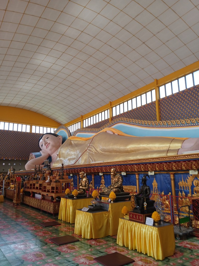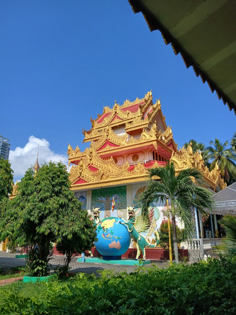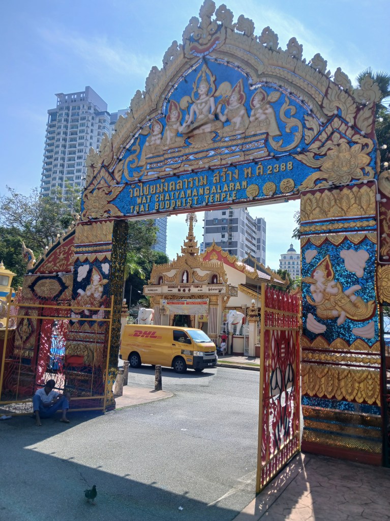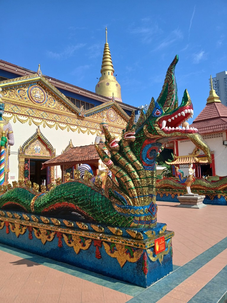 Esco dal tempio birmano, attraverso la strada e mi trovo a rivivere le medesime sensazioni nel complesso della comunità thai: dragoni, deva, Buddha dorati, tra cui l’immancabile Buddha sdraiato, occupano padiglioni che richiamano nell’estetica quelli della madrepatria ma che sono talvolta fin troppo “contemporanei” nella scelta di materiali e finiture.