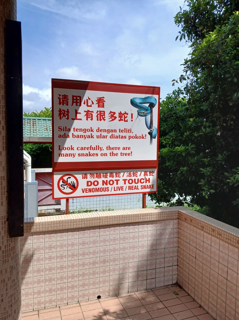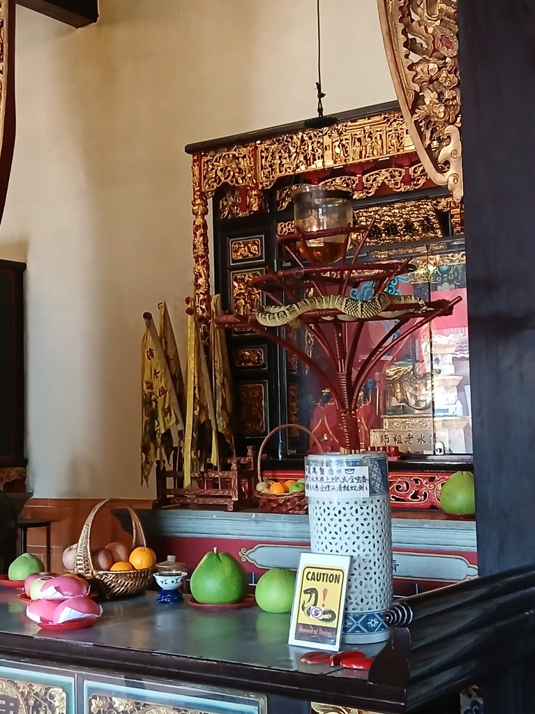 A George Town c’è un luogo che mi attrae e intimorisce al tempo stesso. Mi armo di coraggio e decido di visitarlo. Il famoso ma in realtà piuttosto deludente Tempio dei Serpenti, come viene comunemente conosciuto lo Shé Miào è una delle mete che ogni viaggiatore include nelle sue visite a Georgetown. Si trova in realtà in posizione defilata, vicino all’aeroporto, e si può raggiungere con un taxi o un Grab. Scopro così che i serpenti ci sono, certamente, ma sono talmente inerti e inebetiti da sembrare finti. Anche chi, come me, nutre per i rettili un vero quanto immotivato terrore, si può muovere all’interno della piccola sala di preghiera e nel retrostante giardino, dove i serpenti dormicchiano pacifici sui rami, senza avvertire mai alcun pericolo. Pare infatti che tutti i serpenti accolti nel complesso siano stati privati dal veleno, cosa che nessuno credo desideri verificare!